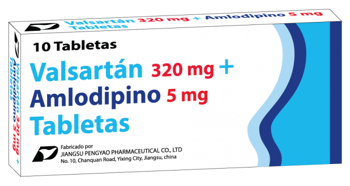 ANTIHIPERTENSIVO Información del ProductoVía de Administracion: OralIndicaciones: Tratamiento de la Hipertensión esencial. Valsartán + Amlodipino Tabletas está indicado en pacientes cuya presión arterial no se controla adecuadamente con Amlodipino o Valsartán en Monoterapia.Presentación: Caja con 10, 100 y Caja Institucional con 1000 Tabletas e InsertoModalidad de Venta: Venta Libre.Marca de Referencia: EXFORGE T®Laboratorio Fabricante: JIANGSU PENGYAO PHARMACEUTICAL CO. LTD