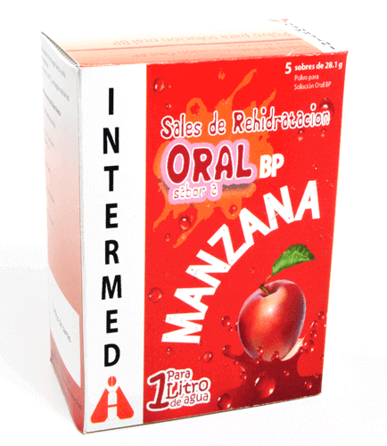 ELECTROLITOS ORALES Información del ProductoVía de Administracion: OralIndicaciones: Tratamiento de la deshidratación causada por la diarrea de cualquier etiología.Presentación: Caja con 5, 20 y 100 (Institucional) sobres con 28.1 g de polvo para reconstituir 1 litro de solución e inserto.Marca de Referencia: Electrolitos Apo®Laboratorio Fabricante: INTERMEDAUSTIN PHARMA INDIA