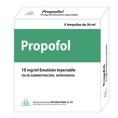 ANESTÉSICOS Información del ProductoVía de Administracion: IntravenosaIndicaciones: Inducción y mantenimiento de la anestesia general, a sedación de pacientes ventilados en cuidados intensivos, la sedación superficial para intervenciones quirúrgicas y técnicas diagnosticas.Presentación: Caja con 5 y 25 Ampollas con 20 ml de Emulsión Inyectable e Inserto.Modalidad de Venta: Bajo prescripción médica.Marca de Referencia: DIPRIVAN®Laboratorio Fabricante: XIAN LIBANG PHARMACEUTICAL CO. LTD.